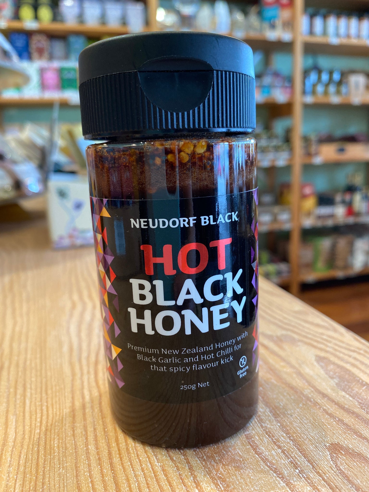 Black Honey premium New Zealand Honey blended with sweet black garlic. Gold medal winner at the NZ Outstanding Food Producer Awards. Try blending with hot water or milk for a delicious drink. Hot Black Honey has cayenne pepper and chilli for that spicy flavour kick. Gluten free and dairy free. 250g in plastic bottle.