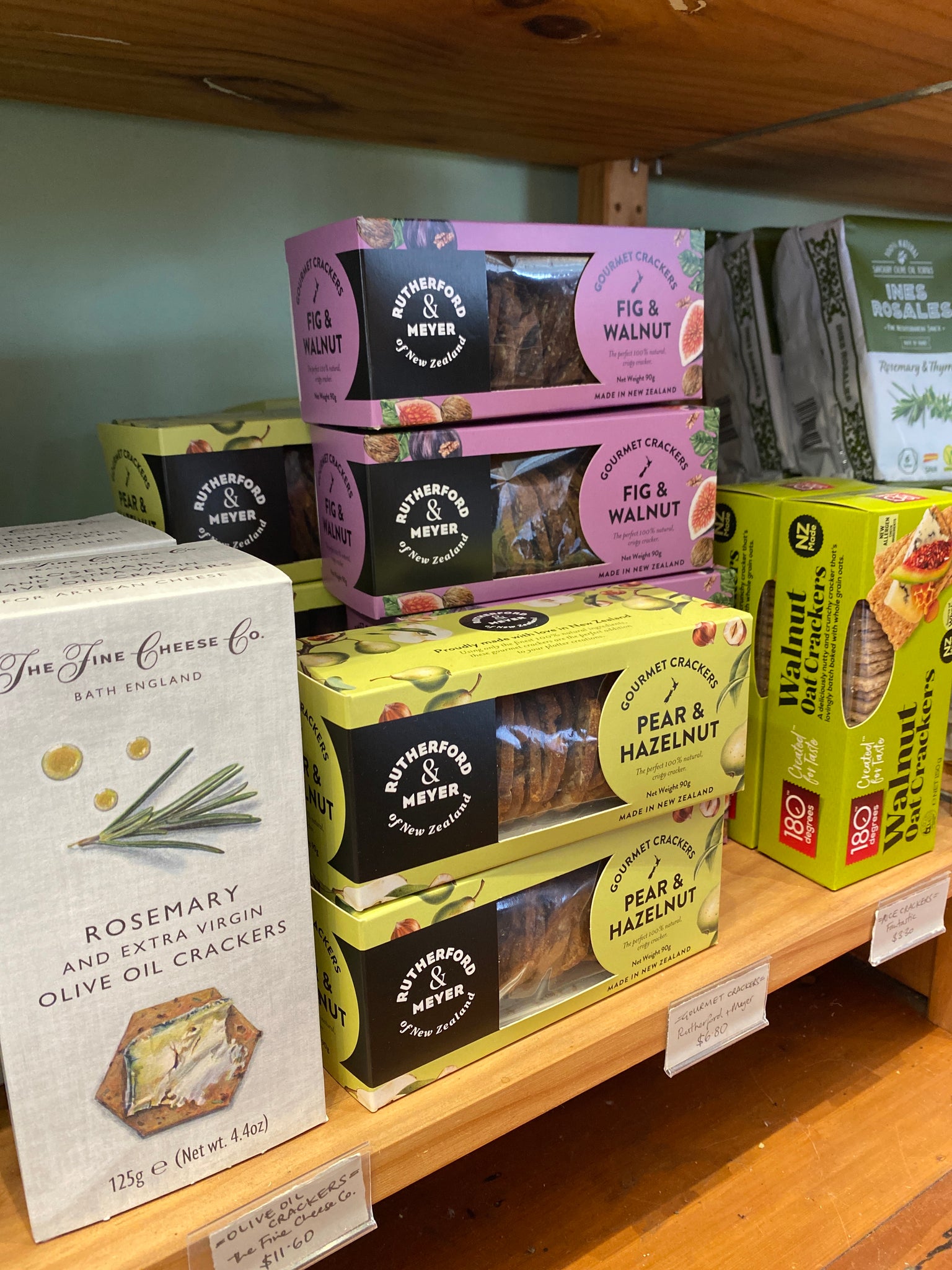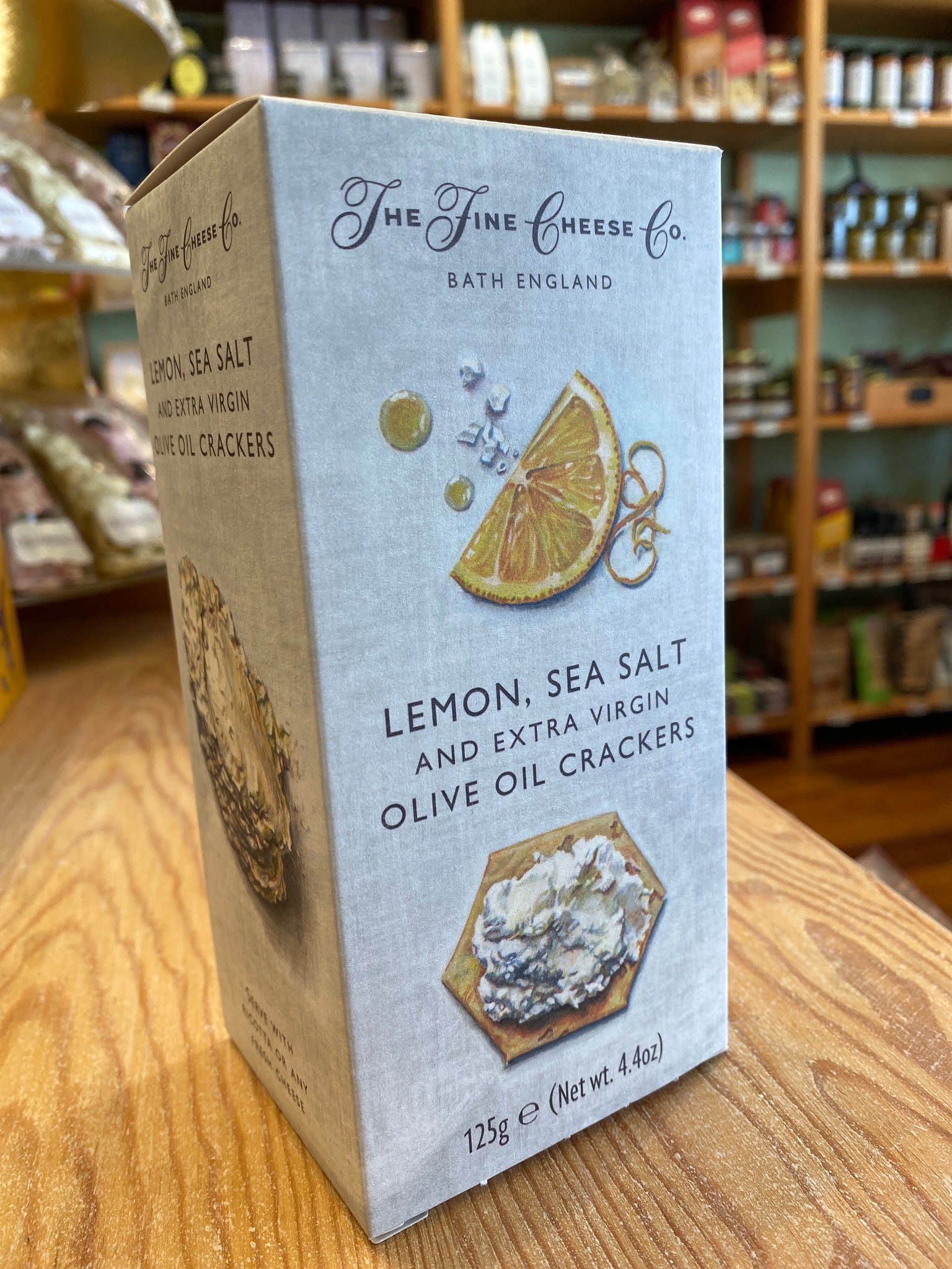 Extra Virgin Olive Oil and Sea Salt Crackers from The Fine Cheese Co in Bath, UK. Ingredients: wheat flour, extra virgin olive oil, autolysed yeast, sea salt, sodium bicarbonate. 125g.